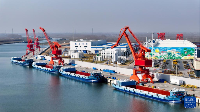 2月16日,在济宁能源集团山东新能船业有限公司,工作人员在船体搭载平台对新能源船舶进行组装作业(无人机照片)。目前,其新能源船舶订单已排满全年。山东省济宁市依托京杭大运河“黄金水道”优势和内河航运全产业链系统